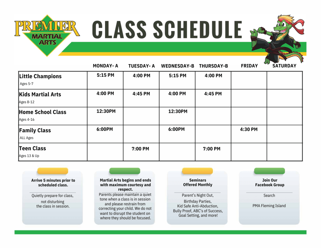 Classes are active, engaging, and perfect for kids who need a positive outlet for movement during the school day. Recommended participation is 1β2 times per week to maintain progress and consistency.